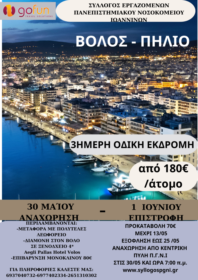 Ο Σύλλογος Εργαζομένων διοργανώνει τριήμερη οδική εκδρομή στο Βόλο, από…